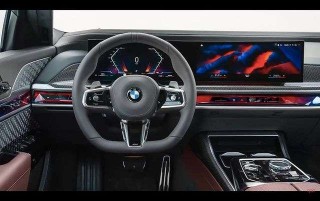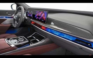 Inside, the BMW i7 has the 31-inch Theatre Screen for the rear passengers - it's an 8K 32:9 widescreen that can tuck itself out of the way when not needed. The front has a digital light bar going through the dash. It features changing ambient lighting and touch controls for the air conditioning. There's a separate curved display for the driver.